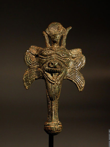 Pazuzu is presented with his winged head over a short column with globular base. The head with demonic features, large wide open eyes, wide nose, open mouth and a short beard. His ears are spread, and his head surmounted between his horns with a small head of a bull with solar disk between the horns. The Pazuzu head is flanked by two pairs of spread wings. A suspension loop at the back of the figure.