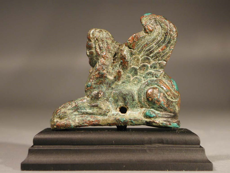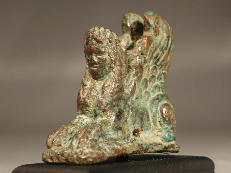 The winged sphinx, a mythological animal with human head and lion body, is crouching with frontal head, long curly hair and raised wings with looped ends. The tail is folded along the left side of the body. The figure is finely modeled with incised details, in a majestic attitude. It is seated on a flat base with two holes for attachment.