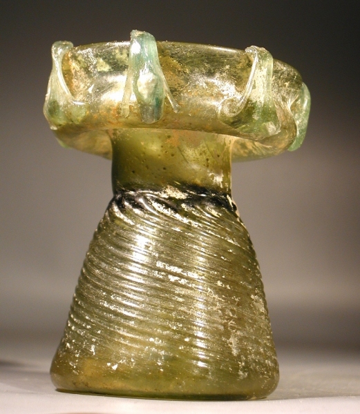The sprinkler with molded bell-shaped body, decorated with diagonal ribbing, concave base, short cylindrical neck and wide collar rim with six applied decorative handles.