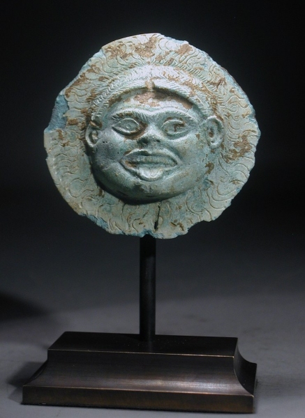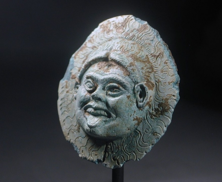 The Gorgon is depicted in the Archaic style, with large features with strong and horrifying expression. She was one of the three mythological sister-monsters whose appearance would turn anyone who laid eyes upon them to stone. The phalera – an armor decoration mounted on the chest, was a kind of medal and was believed to have the power to protect the bearer. It may be found in depictions of the goddess Athena (-Roman Minerva), of Alexander the Great, and of Roman Emperors and military officers.