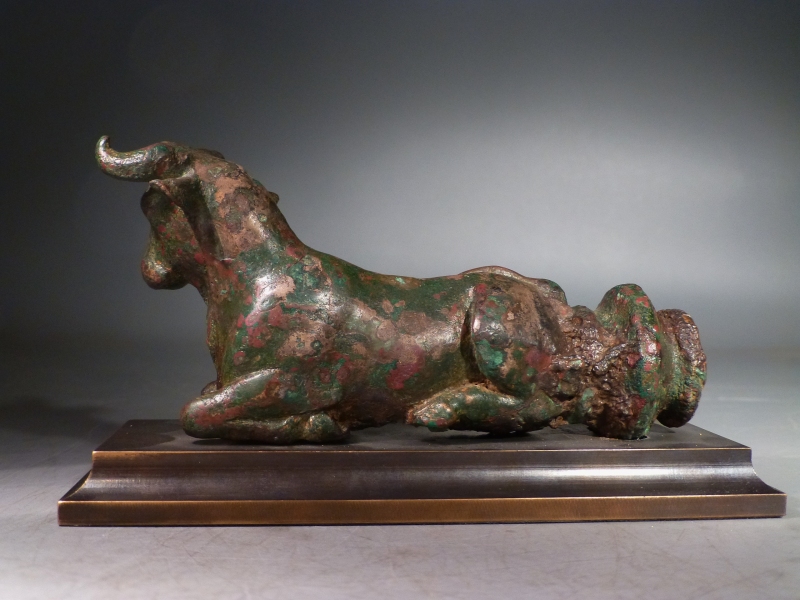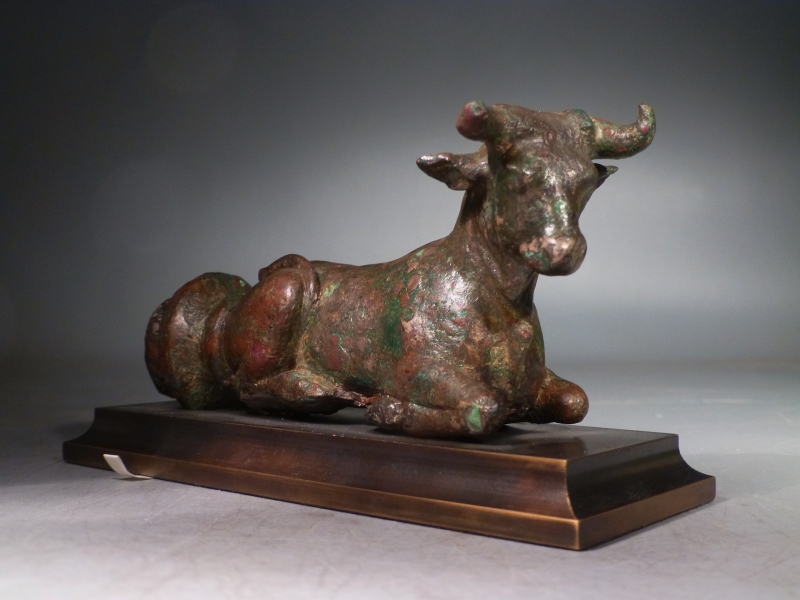 The figure is finely modeled in a realistic style, with details such as the folds of skin beneath the neck, the pointed spread ears and the horns, curling upwards at the tip. The face is life-like and gentle.
