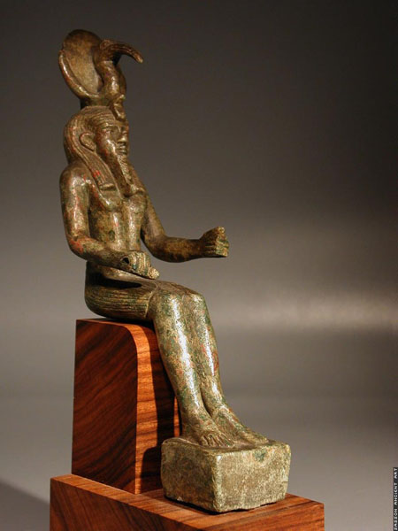 Khonsu, God of Moon, is seated, wearing the moon crescent crown with an Ibis, on top of the royal wig, and the royal beard. He wears a short skirt, and both his hands were holding scepters. His feet rest on a square integral base.