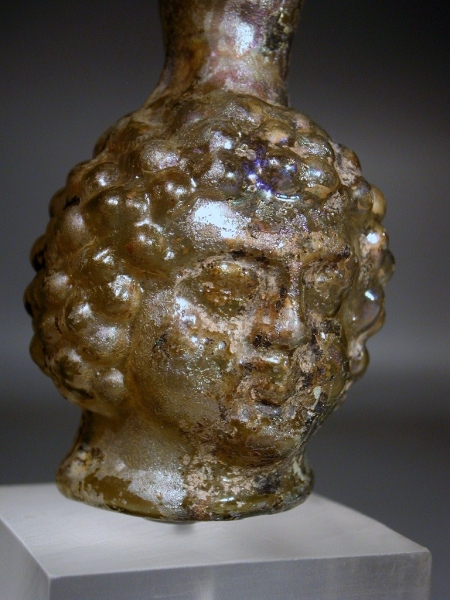 The Janus double head, blown in two parts mold, with rounded faces with chubby features, large eyes, rounded cheeks and chin and small nose. The hair is depicted with thick round curls.