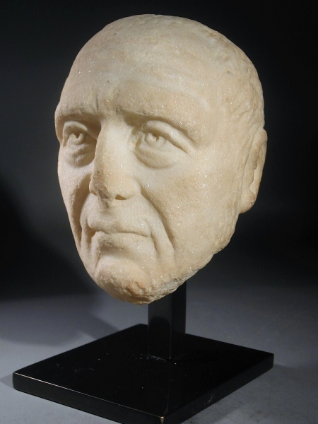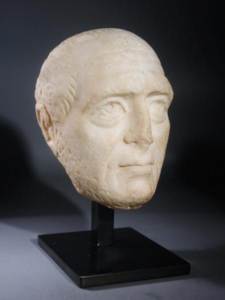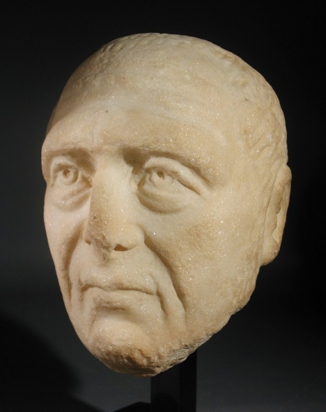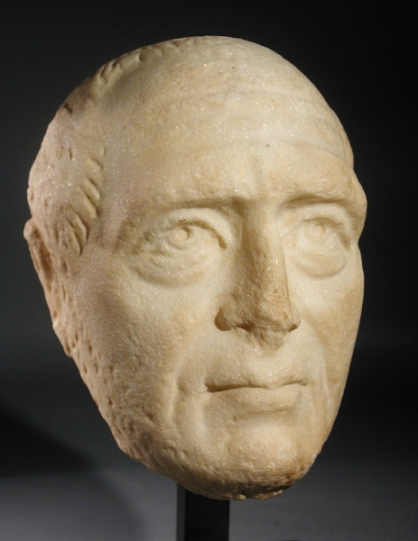 The middle aged man is depicted frontal, looking slightly upwards. He has short hair with a high creased forehead, with a receding hairline on both sides, and a short beard. The oval face with frowning eyebrows, drooping eyelids, and creases below the eyes and at the sides of his mouth. The nose is arched and the mouth is straight, with a gentle smile.