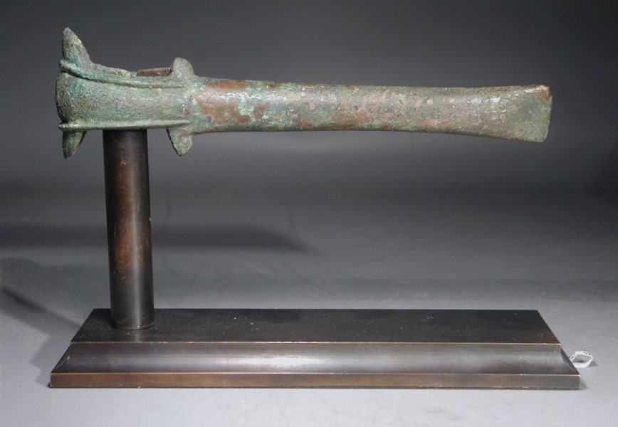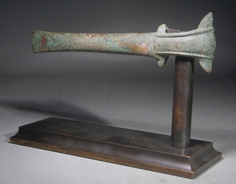 The lugged chisel axe head, with long rounded blade, tapering at the front sharp edge, and a concave oblong socket at the rear, with wing shaped lugs at the neck and base of the socket.