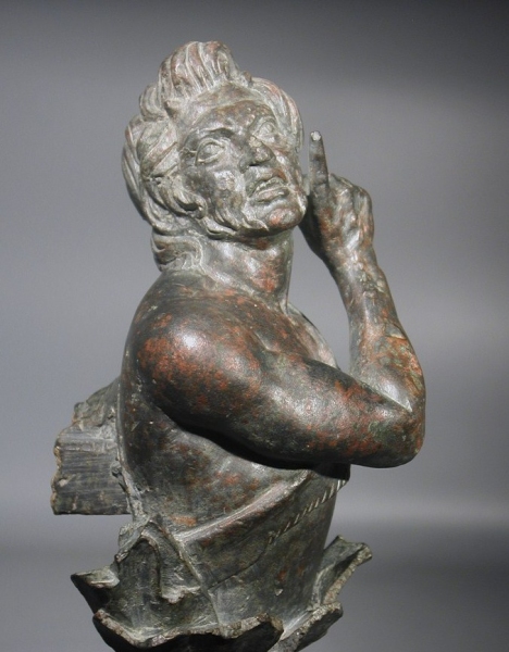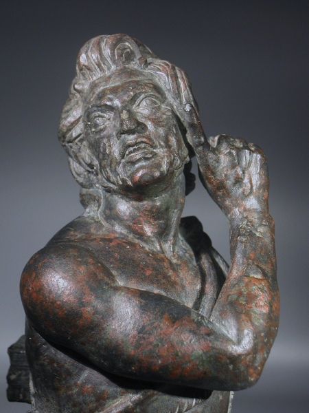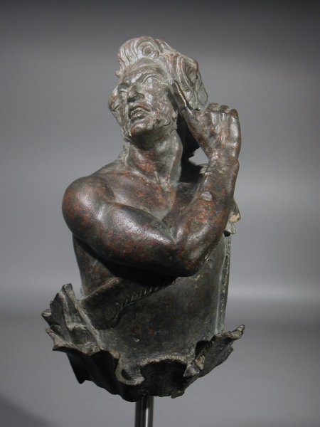 Originally attachment of a chariot or furniture. Missing left arm. Very fine smooth green patina with reddish-brown spots.