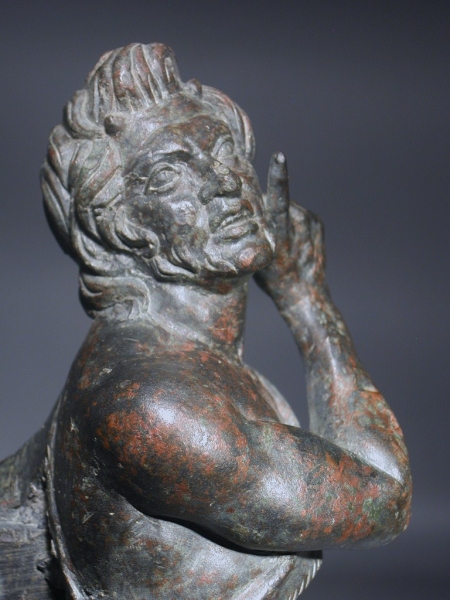 The Satyr is emerging from acanthus in spiral motion, with his head lifted and turned to the right and his right hand pointed near his left cheek. He wears a panther skin, bound across the chest and tied at his left shoulder. The Satyr is modeled with wild and lively features of the head and a powerful muscular body. The head with big locks of hair and short beard on the cheeks, framing the face with large open eyes, arched nose and big mouth with wide fleshy lips, open to reveal the upper row of teeth.