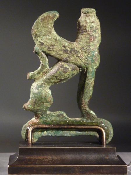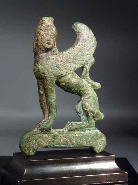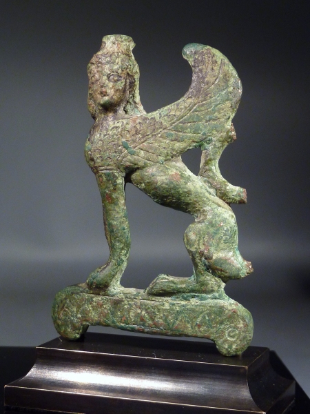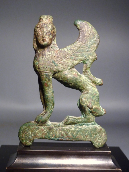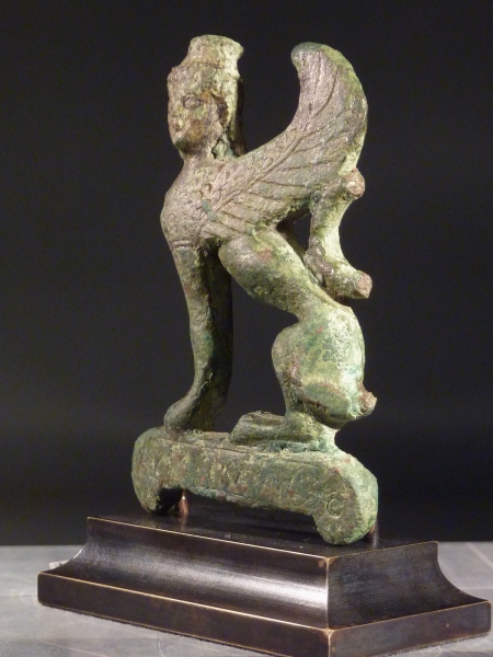 The Sphinx is depicted in fine Archaic style in a frozen pose. The face is of a beautiful woman with stylized long hair, large eyes and shaped lips in Archaic smile. The head is surmounted with cylindrical headdress of the polos type. The body and limbs are long and slender, and ornamental details incised in the wings and the column capital.
