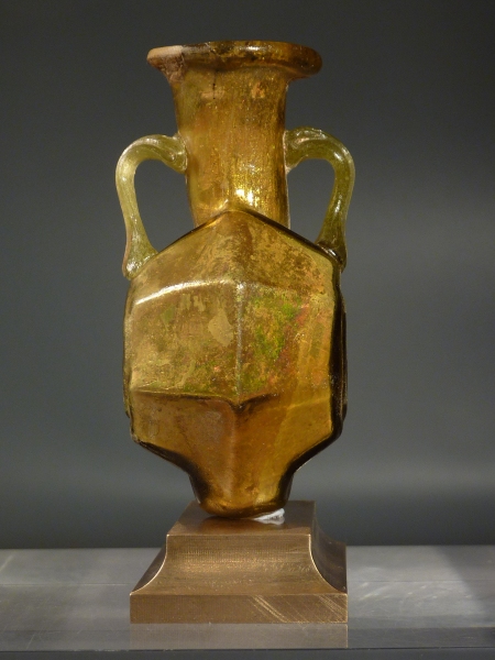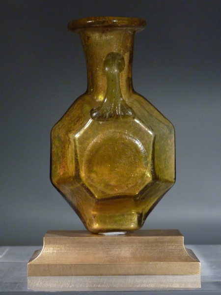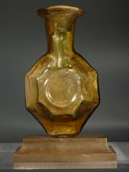 The flask with the body blown in two-part mold, each half of the body consisting of eight panels arranged around an octagonal central panel, with a circular ridge at the center. Uneven rectangular base. Cylindrical neck, with flaring folded rim. Two handles attached from edge of side panels to neck.