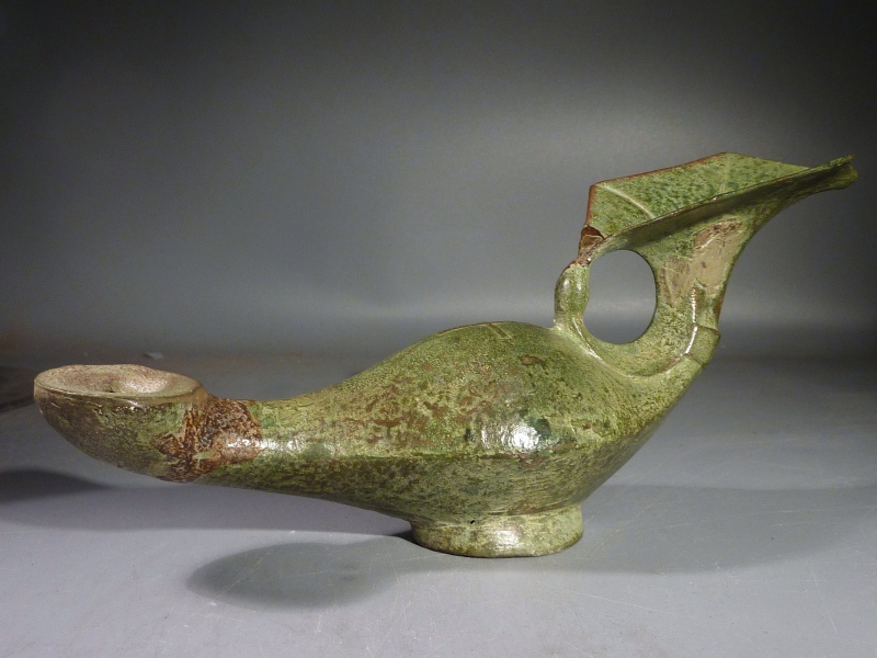 The lamp is of unusual form, and no exact parallels have been found. The general shape with the cross design and the arched handle may be compared with the Byzantine bronze lamps with arched handle with lily blossom, related to the lamps with griffin handle.