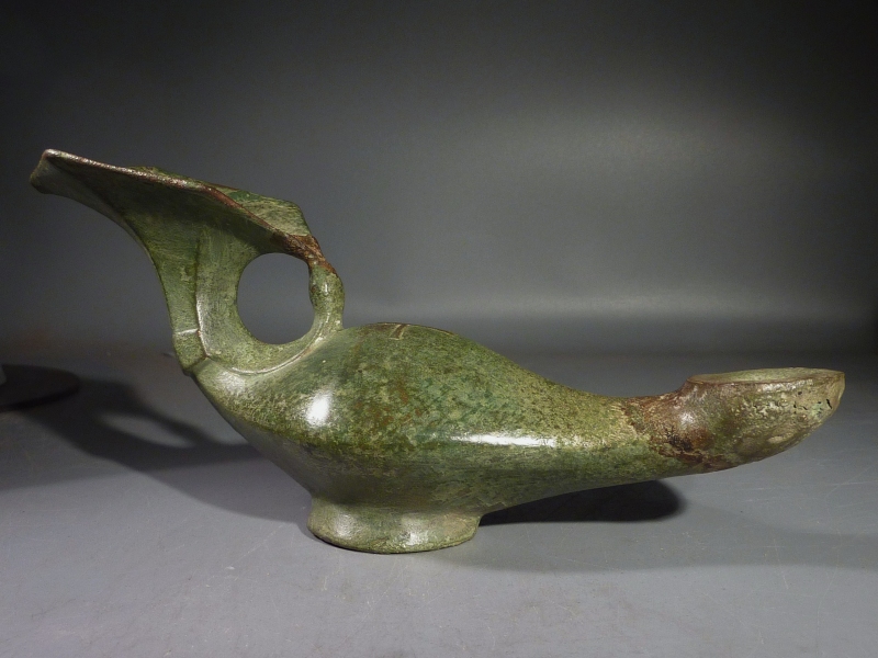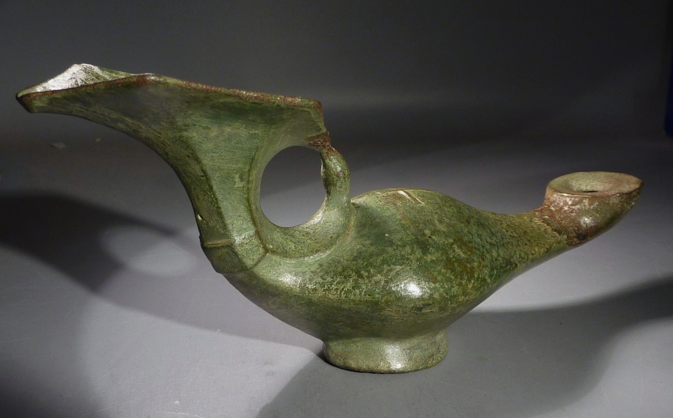 Hole-fillings at the nozzle, base, and at one side of the handle. Fine green patina with spots of brownish encrustation.
