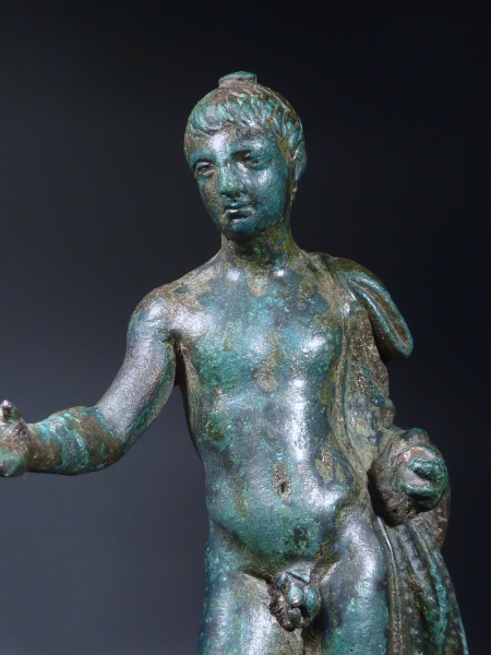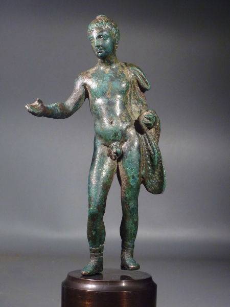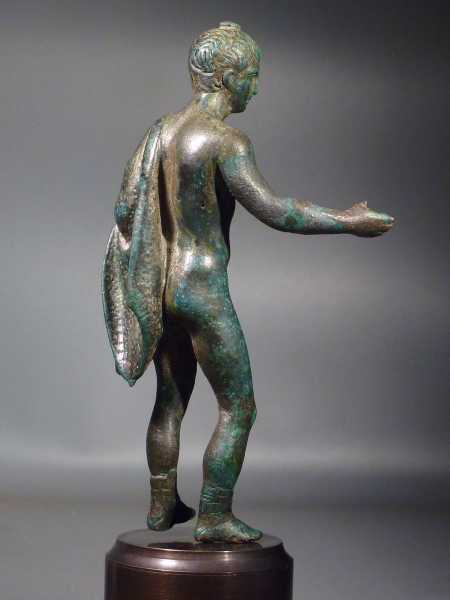 The youth is standing frontal, his weight over his right leg which is slightly bent while his left leg is set backwards and the foot is slightly elevated. His right arm is outstretched, the left arm is bent to hold an attribute. The figure is nude apart from a chlamys falling from his left shoulder over his left arm, and a pair of high sandals.