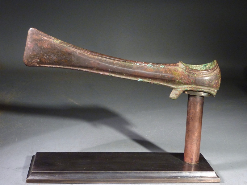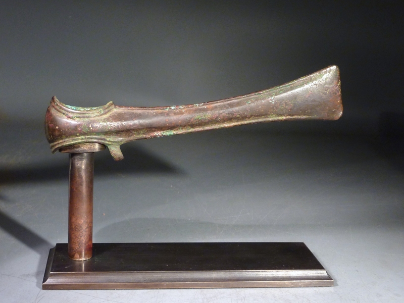 The axe head of “Lugged Chisel” type with long tapering blade, widening at the front sharp edge, concave oblong socket at the rear, and hook bending towards the blade bellow the socket. Fine decorative ridges along the upper and lower contour of the axe.