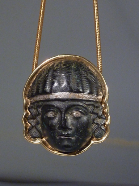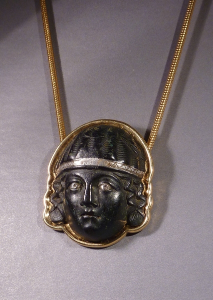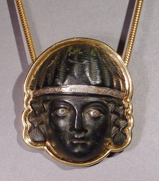 Early Roman bronze applique head of a woman with silver eyes and diadem, set in modern 18k gold setting.