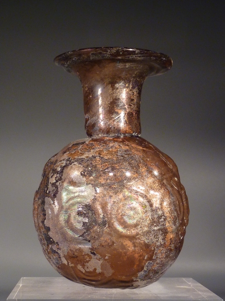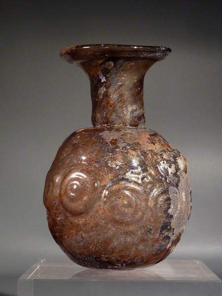 The body blown in two-parts mold decorated in relief with three horizontal registers with geometrical patterns. Two registers with concentric circles topped by a register with protruding circles. Space between registers filled with lozenges filled with dots. The base is decorated with radial lines.