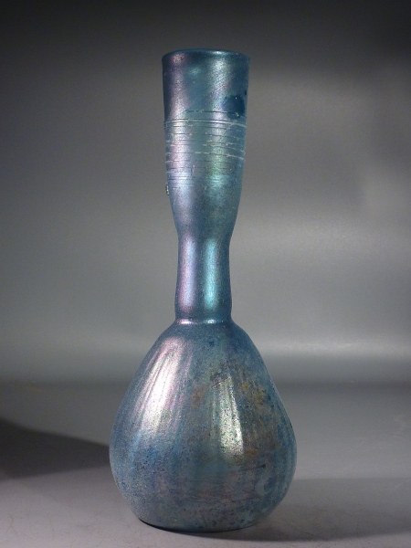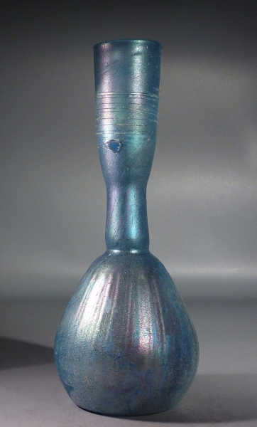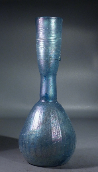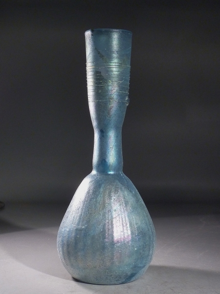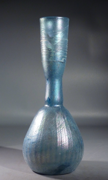 Roman light blue glass bottle with ribbed body and trailed neck.