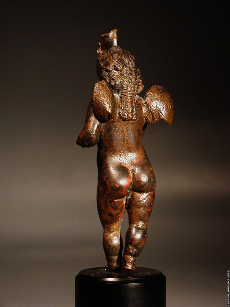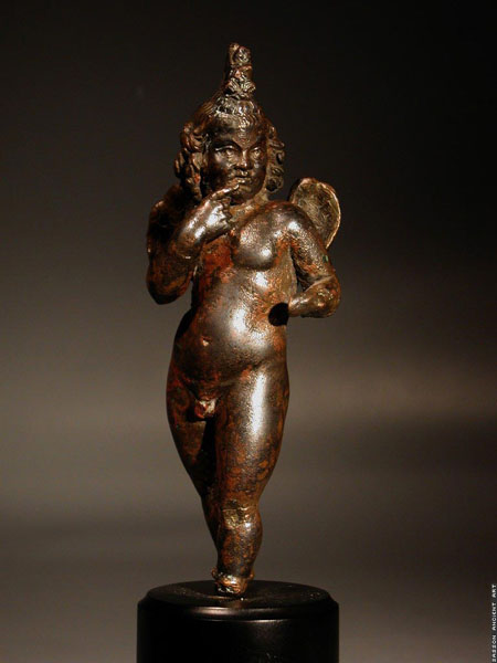 Eros, the winged chubby child god of love, is standing nude, wearing the double crown of Egypt, holding his finger to the mouth, both attributes of the Egyptian child god Harpocrates. The figure is finely modeled with twisted spiral movement, with the head turned to the left. The head with beautiful expressive face, with inlaid eyes of yellow metal. The elaborate coiffure carefully modeled, with waves of spiral locks falling on the back. The wings details are finely incised.