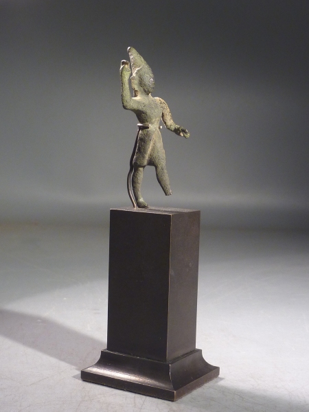 The god is striding with his right arm raised to smite, his left arm and his left leg set forward. He wears a tall conical crown and a folded skirt. His long hair falls over his back.