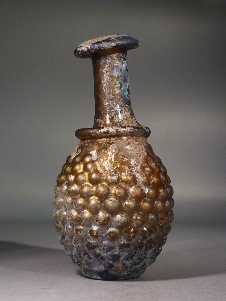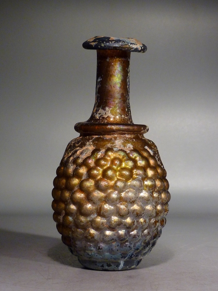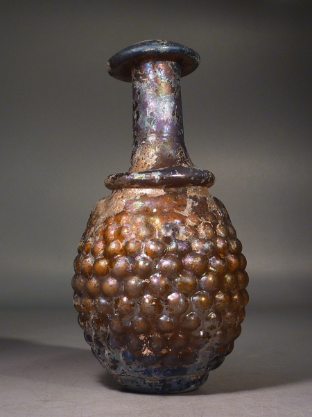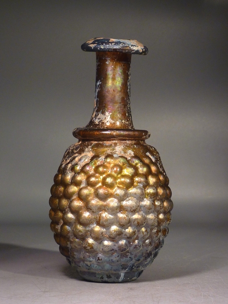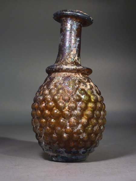 The oval body blown into two parts mold with grapes design on base ring with pontil mark. A long cylindrical neck with folded ring shoulder and flaring rim folded out and inward.