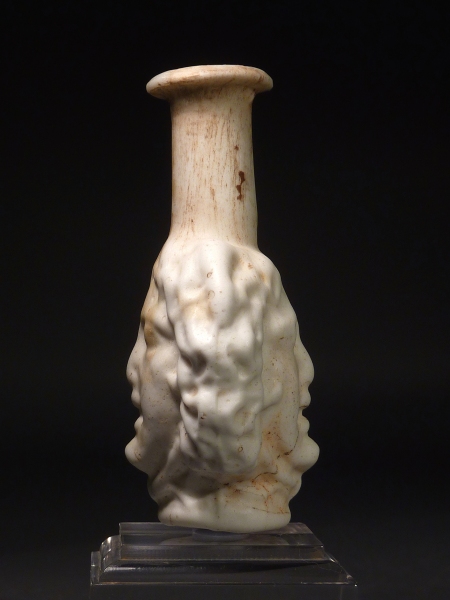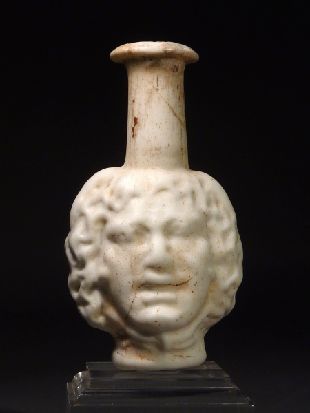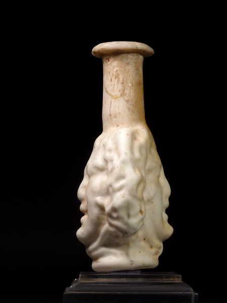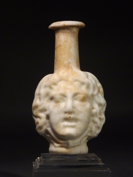 The flask with the body blown into a two-part mold, in the form of a Janus head, with two faces of Medusa back to back. A cylindrical neck with a flaring folded rim and a flat disc base. The Medusa faces are finely modeled with almond-shape eyes, small nose, fleshy lips, protruding chin, and framed by snaky hair, tied in a knot below the chin. A pair of wings at the upper sides of the head.