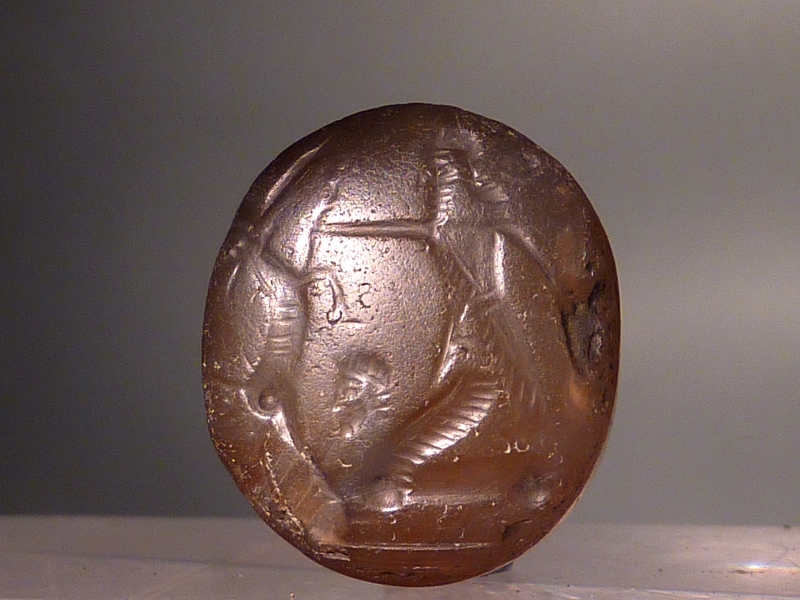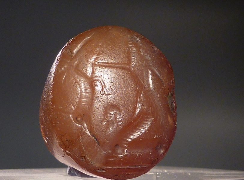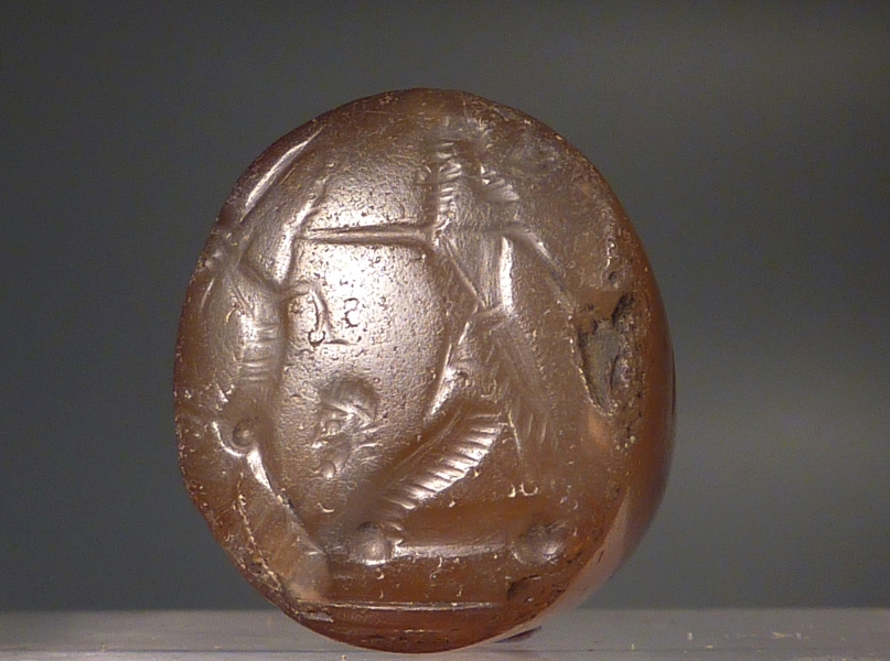 Brownish grey Chalcedon conical seal depicting a crowned king standing on a crouching winged sphinx, hunting an ibex. The king is depicted on the right, in profile to the left, holding the ibex at its raised front leg. The sphinx human head is depicted in the center.