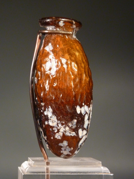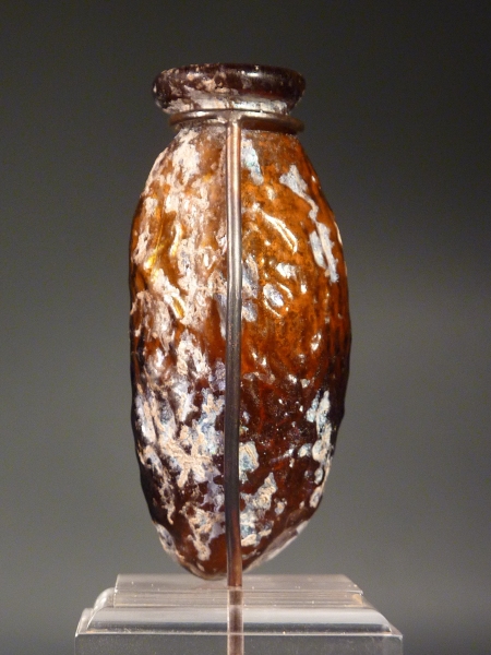 The body blown into two-part mold, modeled in the form of the date fruit, with short cylindrical neck and flaring folded rim.