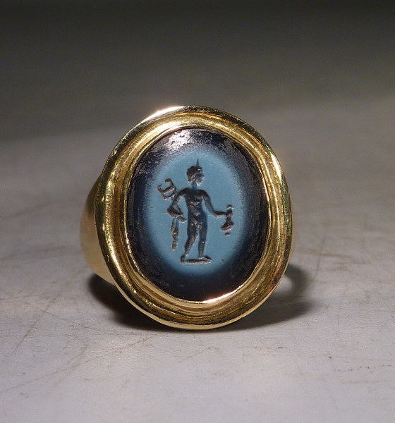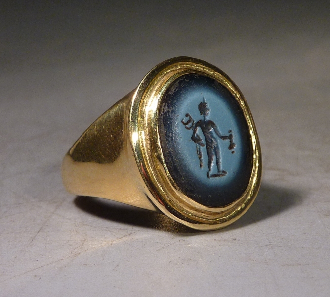 The oval nicolo intaglio (banded agate of two layers with blue over black colors) engraved with the figure of Hermes (- Mercury, the gods messenger) standing naked, in contraposto, holding the caduceus (-the messenger staff) and the money pouch, his chlamis (-the travelers garment) is draped over his right shoulder and arm.
