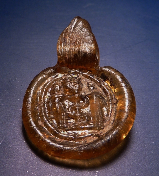 The golden amber glass amulet, in the form of a circular pendant with a loop on top, depicts in molded relief the biblical theme of Adam and Eve in the Garden of Eden. Adam stands on the right and Eve on the left, flanking the tree, with the snake coiled around it.