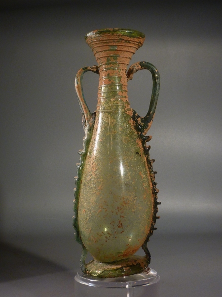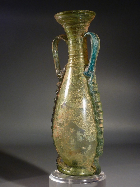 Roman greenish yellow glass amphora with turquoise-green glass twin handles.