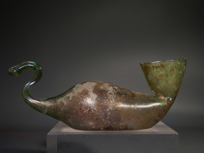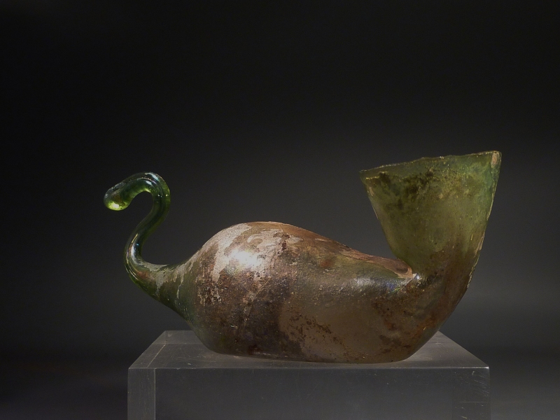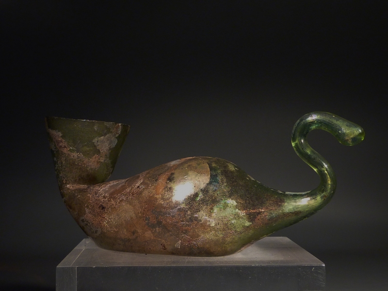 The glass askos with bird shape body on concave base with s-shaped long neck and conical opening forming the tail of swan.