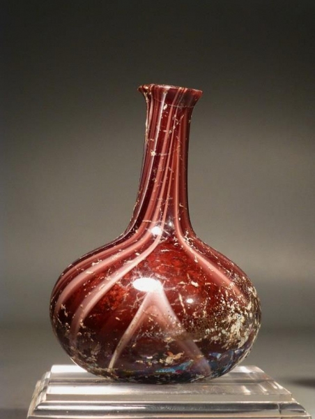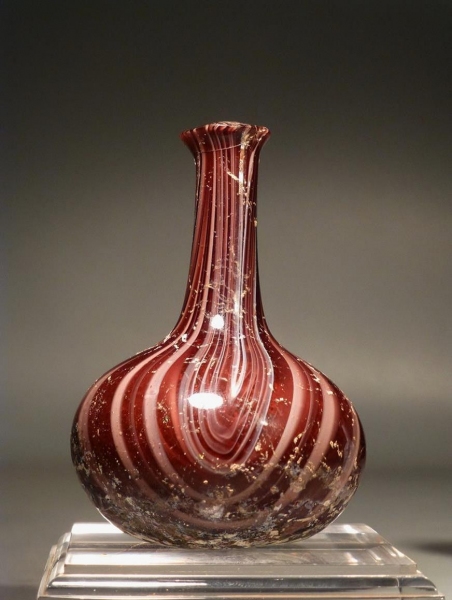 Early Roman red and white glass ribbon flask. Click on any image to enlarge it.