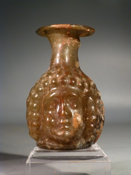 The flask with body blown into a two-part mold in the form of a Janus head, with two faces of a Putto with chubby features, framed by heavy curly hair. A cylindrical neck with flaring folded rim, flat base.