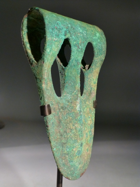 The battle axe of transitional type between the wider “Eyeglasses” and the narrower “Duck Bill” types, with oblong rounded blade with central ridge, fenestrated with two oblong openings, and a socket at the back.