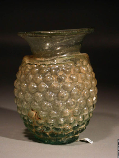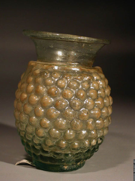 Roman moulded light green glass ???Grapes?? flask with short neck