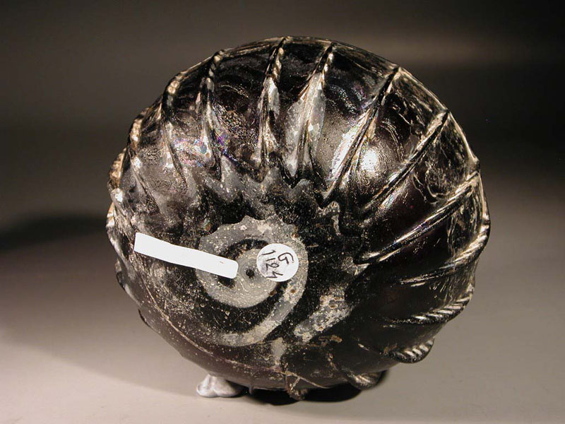 Early Roman purple glass ribbed bowl with white marvered trail