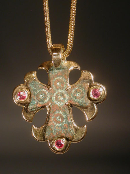 Early Christian bronze cross pendant in modern gold setting