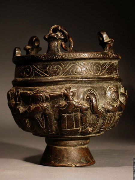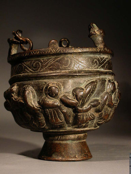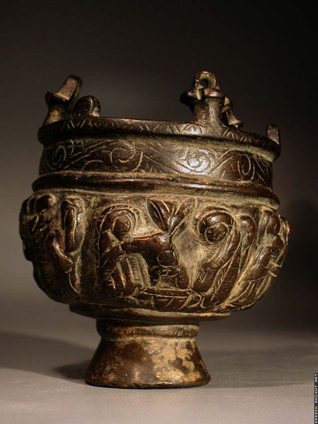 The solid cast bronze censer (-incense burner) of hemispherical form on conical foot, a cylindrical rim with three projections designed as “fleur de lily” with suspension holes for chain, (small part of the chain remained joint to one of the projections). The rim and base are incised with floral motives.