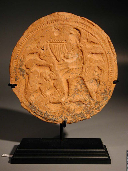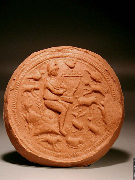 Early Christian terracotta stamp depicting Christ or King David as Orpheus, playing the harp before the animals