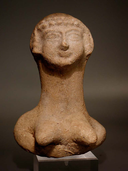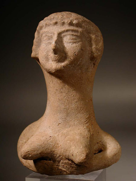 The Astarte bust with molded head and upper modeled body with large breast. The head with broad face with large almond shaped eyes, long nose and wide mouth with thick lips with raised tips. The hairstyle, influenced by the Egyptian style, with thick curly hair.