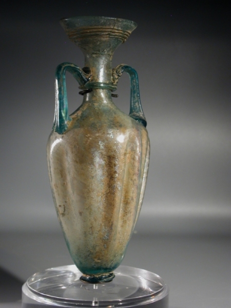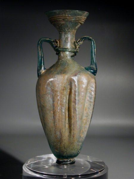 Roman bluish-green glass amphoriskos with molded body and twin deep turquoise glass handles.