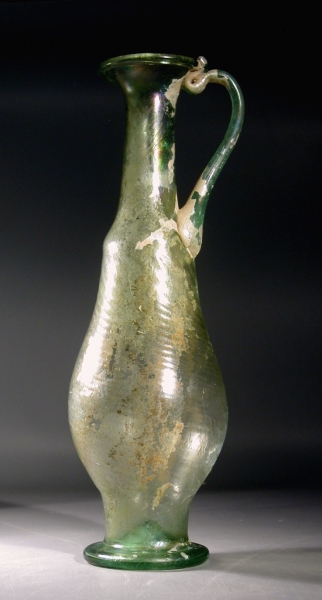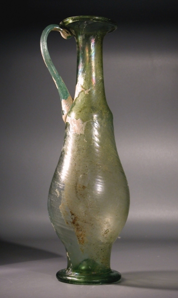 Roman light-green glass elongated jug with one handle, molded body with diagonal ribbing.