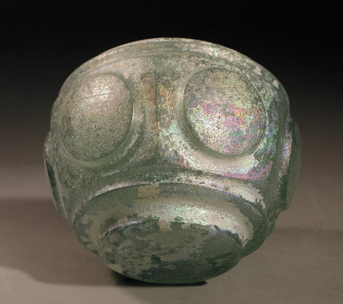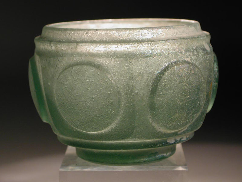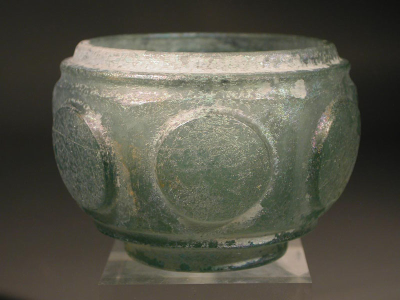 Sassanian bluish-green cut glass small bowl or pyxis.
